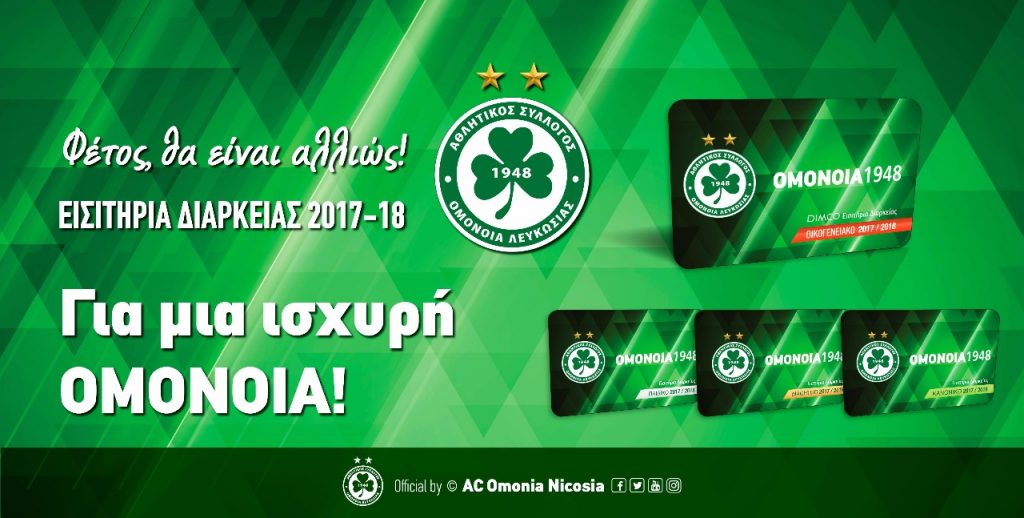 Η ΟΜΟΝΟΙΑ ενημερώνει πως θα λειτουργήσει συνεργείο έκδοσης εισιτηρίων διαρκείας για την αγωνιστική περίοδο 2017-2018 τις πιο κάτω μέρες: